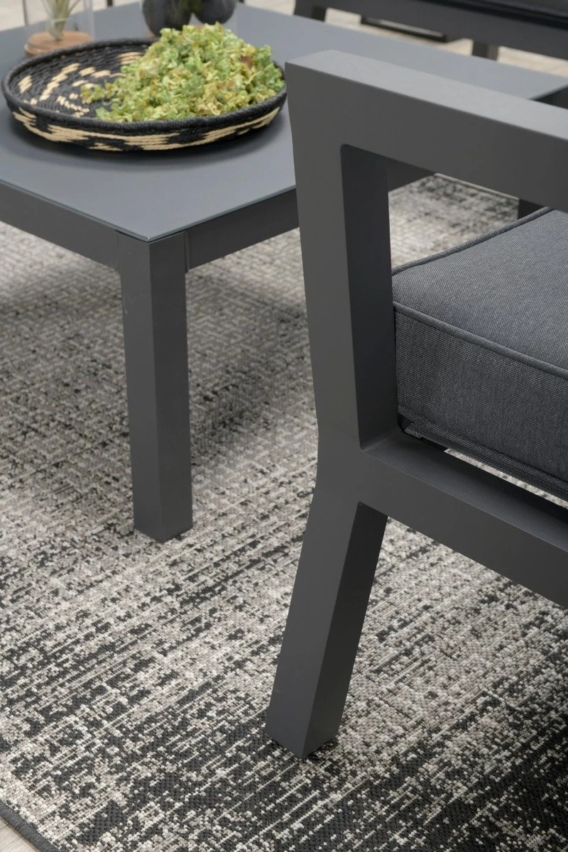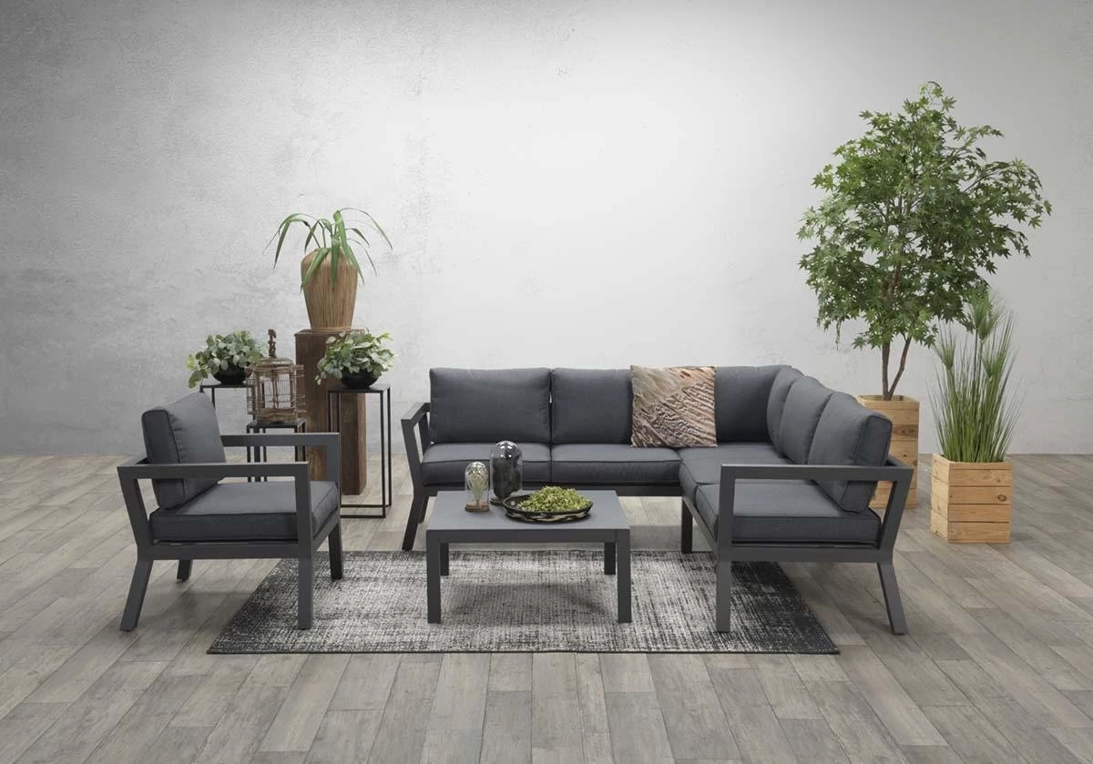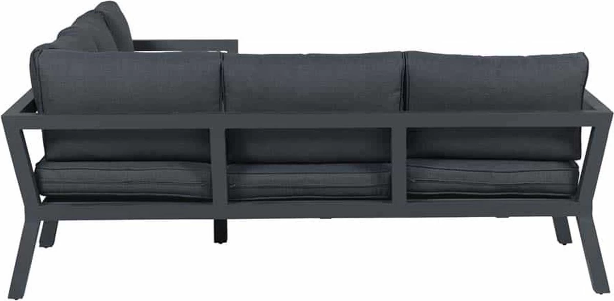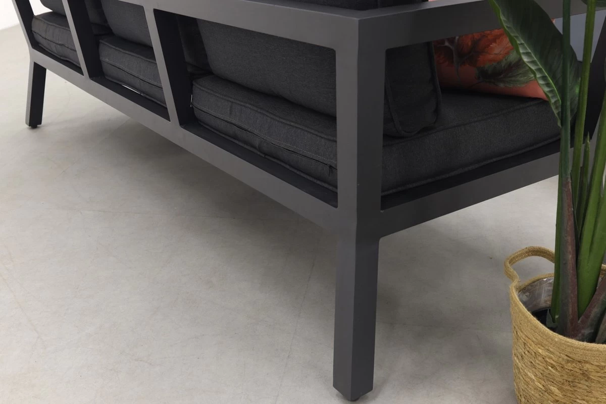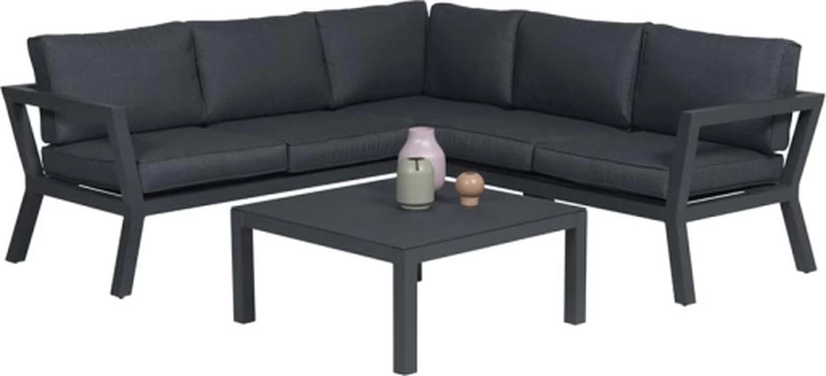 De set bestaat uit twee bankdelen en een tafel. Zowel de hoekbank als tafel hebben een aluminium frame. Hierop is een beschermende poedercoating aangebracht. Aluminium is sterk, weerbestendig en onderhoudsvriendelijk. De comfortabele loungekussens hebben een waterafstotende coating, wat er voor zorgt dat regenwater niet direct wordt opgenomen in de stof. Als de kussens niet worden gebruikt, wordt geadviseerd om deze droog op te bergen.