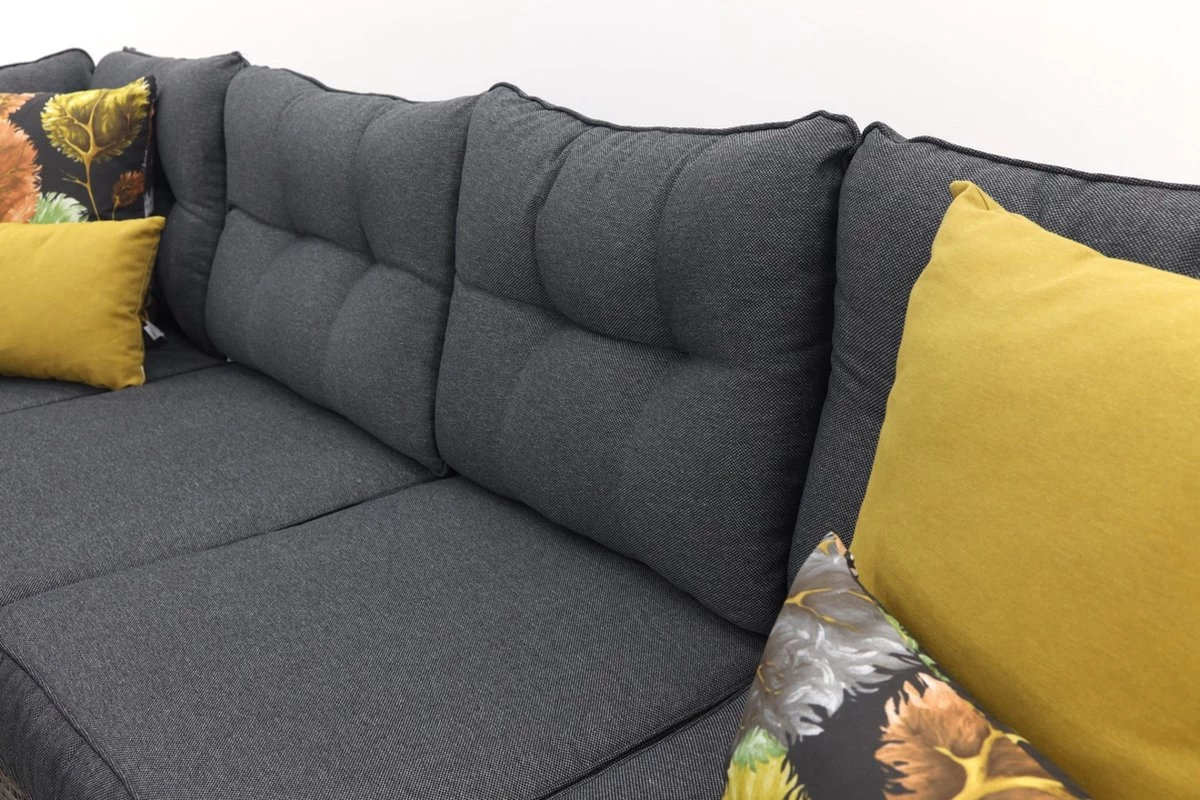 Ben je op zoek naar een comfortabele loungeset om heerlijk in te kunnen ontspannen, maar ook lekker in kunt eten? Met de Jaru lounge dining set hoef je geen moeilijke keuze meer te maken tussen een dining set of een loungeset. Deze mooie en ruime lounge dining set heeft het allebei! Deze set is vervaardigd uit een onderhoudsvrij aluminium met daaromheen weerbestendig wicker in de kleur organic grey, waardoor je het hele jaar kunt genieten van deze mooie lounge dining set. Het wicker is gemaakt van een stevig kunststof waardoor de set zeer duurzaam is. Deze set wordt compleet geleverd met hoogwaardige kwaliteit polyester zit- en rugkussens. De zitkussens zijn bovendien voorzien van een rits, waardoor de hoesjes met de hand gewassen kunnen worden. De kussens zijn niet 100% waterdicht, maar zijn wel voorzien van een waterafstotende coating. Dit is vooral erg praktisch als er bijvoorbeeld op het kussen wordt gemorst met drinken. Je veegt het vocht er namelijk gemakkelijk weer af. Na gebruik kunnen de kussens opgeborgen worden in de schuur of in een kussenbox. De ruime bijpassende lounge dining tafel is voorzien van een mooie geharde glasplaat. Deze lounge diningset bestaat uit twee losse bankdelen, een tafel en twee krukjes. De bankdelen kunnen aan de onderzijde door middel van clips eenvoudig aan elkaar vast worden gezet. Na ontvangst van de set moet alleen één armleuning en het onderstel van de tafel gemonteerd worden, dit is uiteraard eenvoudig zelf te doen. De Jaru lounge dining set is leverbaar in diverse kleurstellingen. De afmetingen van deze setopstelling zijn: L 255 x B 205 x H 85 cm. De tafel is 150 cm lang en 80 cm breed.