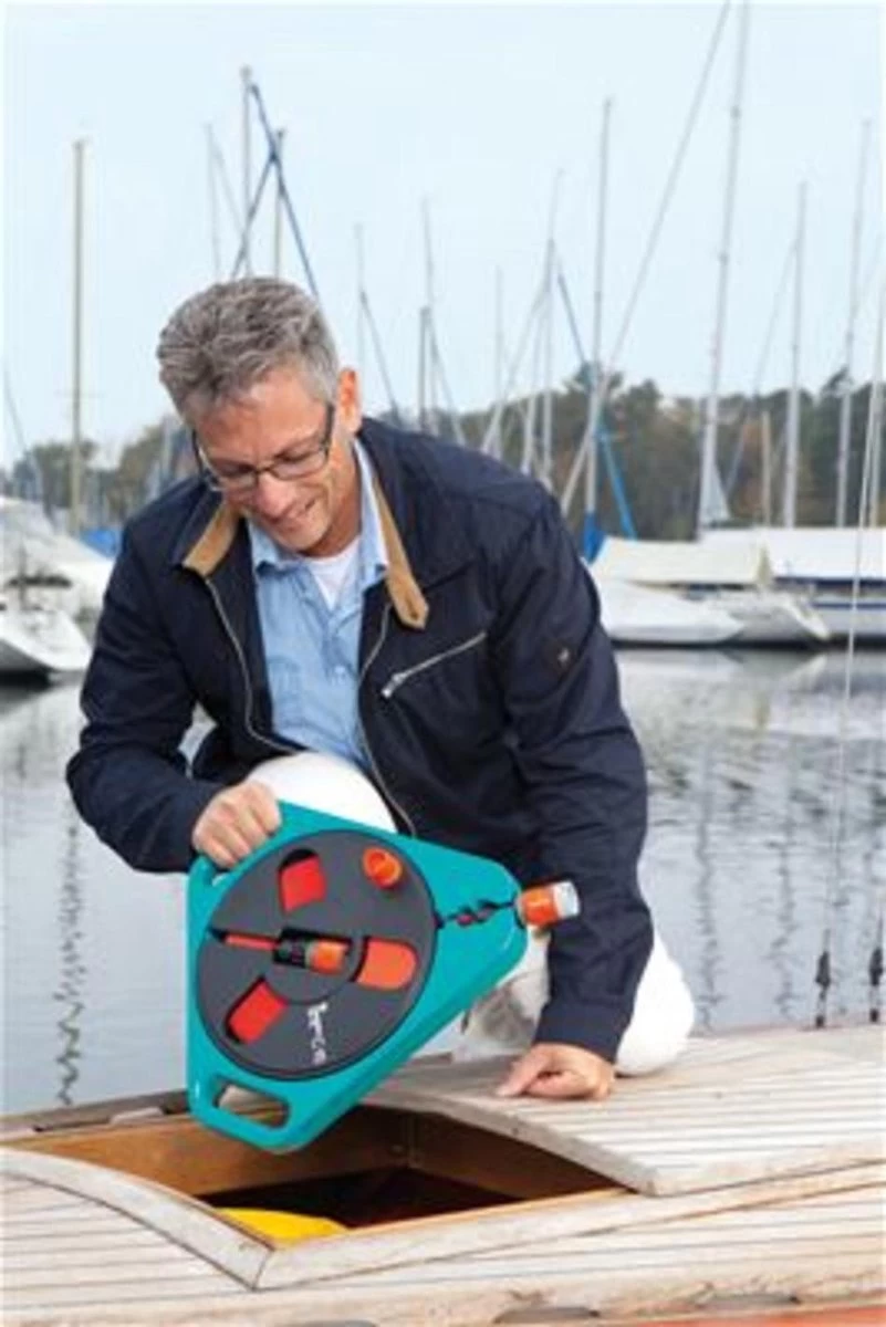 Gardena roll-fix, 20 m platte slang in cassette Licht en compact. Geïmpregneerde platte slang. Met veiligheids automaat die voorkomt dat bij het onopzettelijk onder druk zetten van de nog niet afgerolde slang, de draagcassette stuk gaat. Barstdruk boven 25 bar. Compleet met Original Gardena System aansluitstukken en tuinspuit. roll-fix 20 – 20 m.