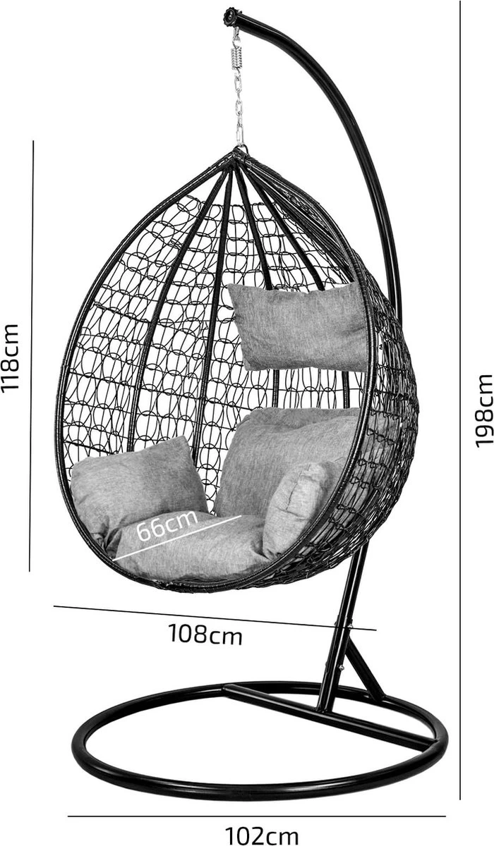 Deze mooie zwarte hangstoel met standaard en beige kussens zorgt ervoor dat je helemaal tot rust komt. Een comfortabele ei stoel / schommelstoel, waardoor het lezen van boeken, ontspannen voor de tv of gewoon ontspannen in de tuin nog leuker wordt! Het wordt de favoriete stoel voor elk gezinslid. De hangstoel kan zowel binnen als buiten worden gebruikt.