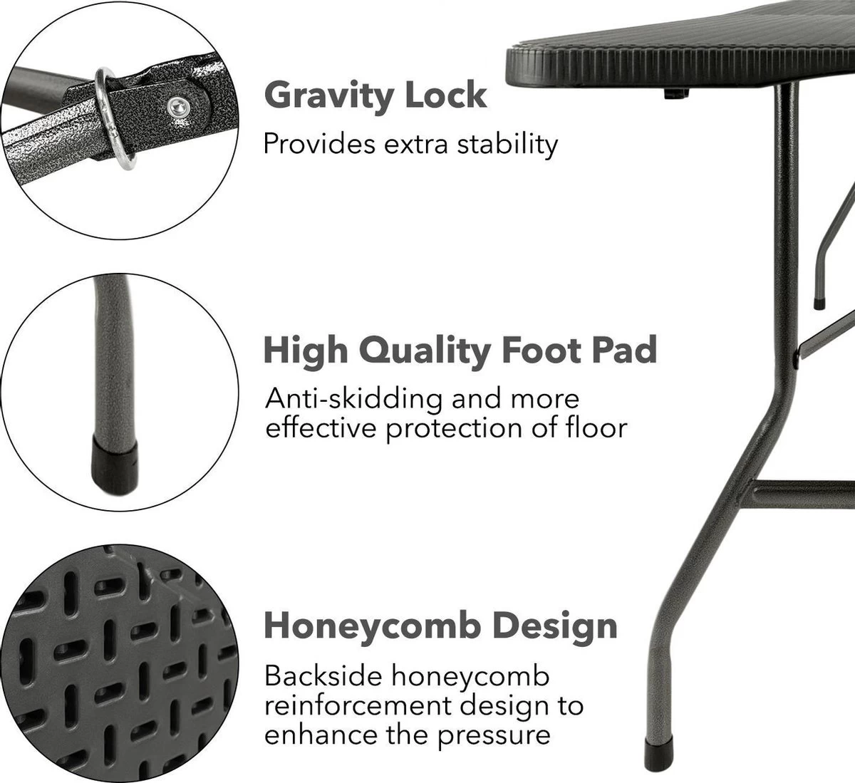 De MaxxGarden Vouwtafel is gemaakt van high-density polyethyleen (HDPE) en gepoedercoat staal. De vouwtafel heeft een rotanlook en is lichter en steviger dan traditionele vouwtafels. De tafel is zeer eenvoudig op te vouwen en op te zetten. Het tafelblad in polytheen is bestand tegen schokken, barsten, afschilferen en vlekken. Hij is UV-beschermd, zal niet barsten of afbladderen en is gebouwd voor gebruik binnen en buiten. Het gepatenteerde stalen frame ontwerp biedt een stevige basis en heeft een weerbestendige afwerking. Ideaal voor familiedagen, bbq’s, verjaardagen en nog veel meer.