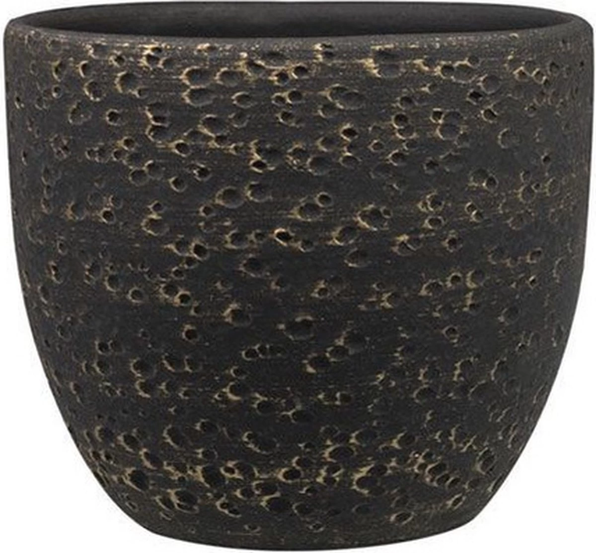 Plantenpot/Bloempot in het lava-look zwart Dia 15 cm en Hoogte 13 cm. Deze bloempotten zijn geschikt voor binnen. Serienaam Rinca. Materiaal: keramiek. Niet vorstbestendig.