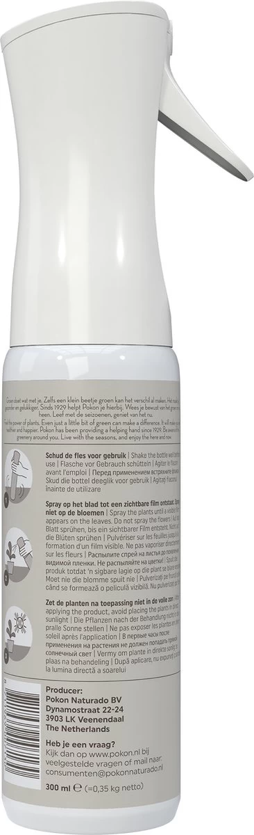 Planten kunnen na verloop van tijd doffe bladeren krijgen. Pokon Powerspray Kamerplanten is een verzorgende spray een geeft het blad extra glans. Planten worden binnen korte tijd zichtbaar frisser, vitaler en gezonder. Pokon Powerspray Kamerplanten is het hele jaar te gebruiken. Geef de planten een aantal uur voor behandeling water dit verbetert de werking. Maak vooraf de bladeren waar veel vuil op zit schoon met een vochtige doek. Schud de fles voor gebruik. Spray op het blad en de wortels tot een zichtbare film ontstaat. Spray niet op de bloemen. Zet de planten na toepassing niet in de volle zon.