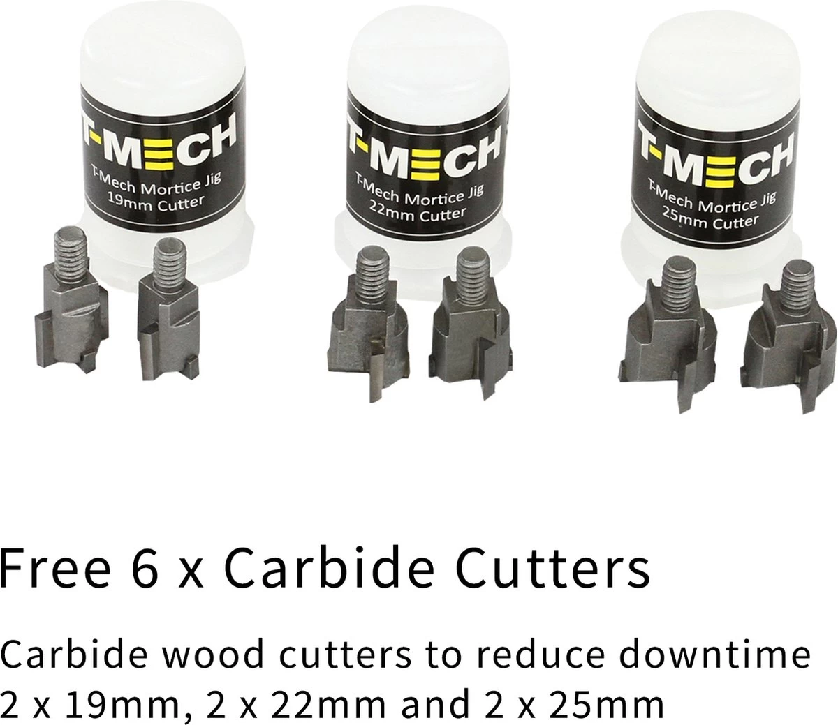 • 6 GRATIS hardmetalen frezen: 2 x 19 mm, 2 x 22 mm, 2 x 25 mm