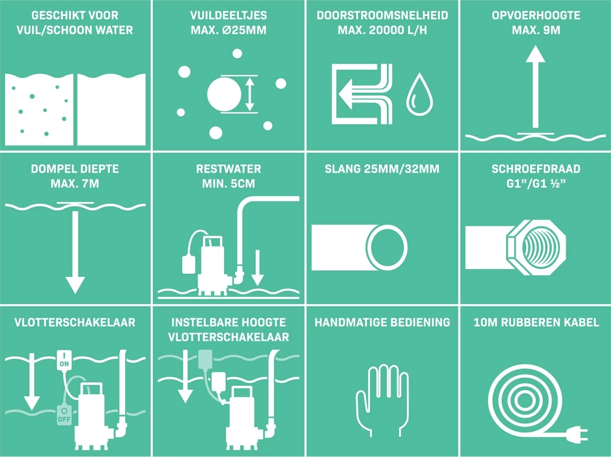 - Deze krachtige pomp heeft een pompcapaciteit van 20000 liter vuil- en schoonwater per uur en kan vuildeeltjes tot een maximale korrelgrootte van 25mm verwerken. Deze dompelpomp kan in water staan tot 7 meter diep.